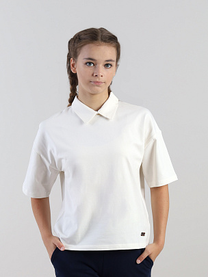Футболка для девочки с коротким рукавом. Вырез горловины круглый, окантован бейкой из основного полотна.